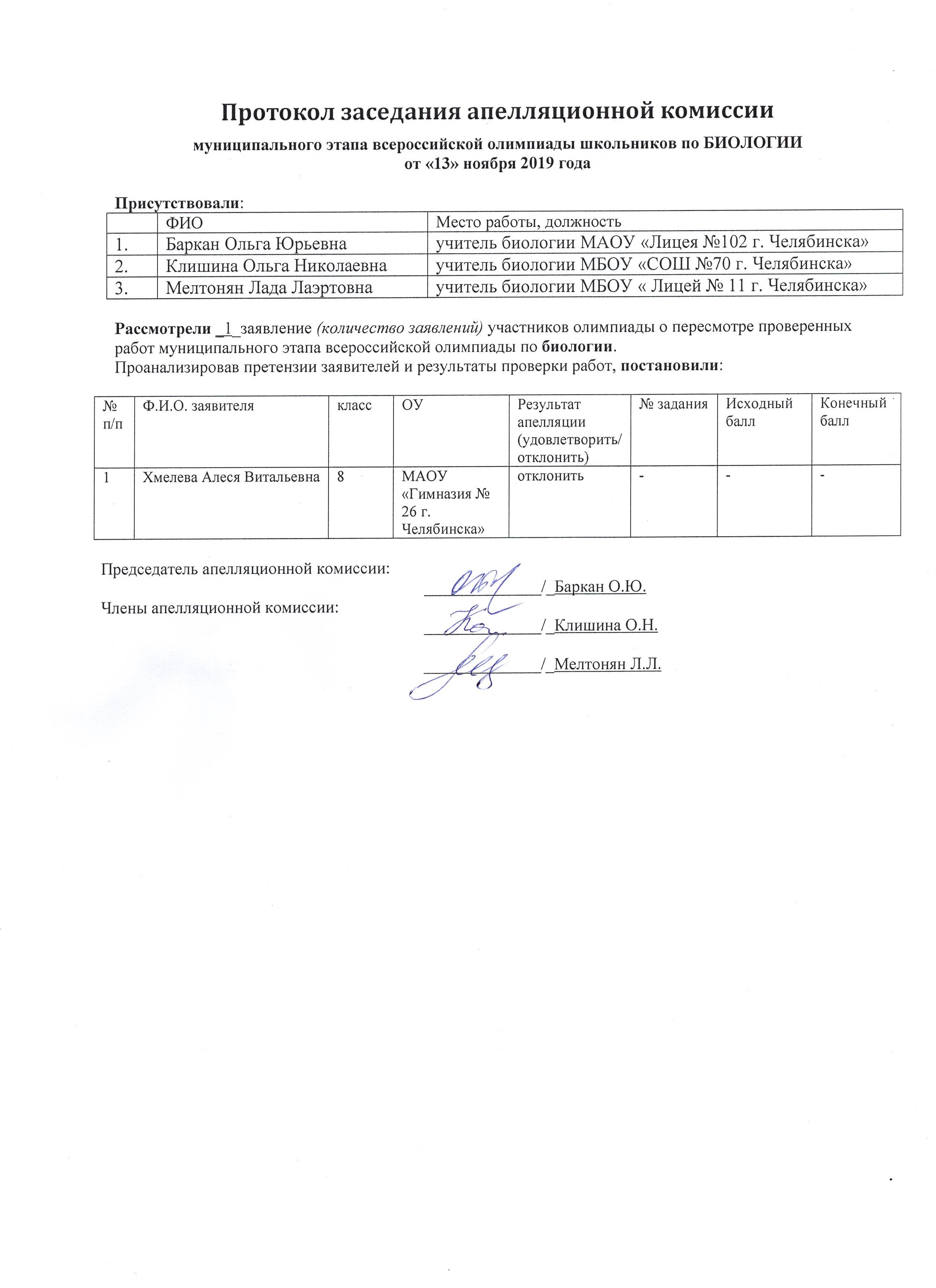 Важная информация об олимпиаде В соответствии с приказом Комитета по делам образования г. Челябинска участниками муниципального этапа являются:1) Победители и призеры муниципального этапа всероссийской олимпиады школьников прошлого учебного года (Результаты на муниципальном этапе Областной олимпиады (олимпиады юных) не учитываются!!!) 2) Участники школьного этапа текущего учебного года (вне зависимости от наличия или отсутствия диплома школьного этапа), набравшие балл не менее проходного балла, установленного Комитетом по делам образования г. Челябинска. Если вы считаете, что обнаружили ошибку в списках участников, то напишите об этом в специальном разделе форума и обязательно укажите кого на ваш взгляд не хватает в списке или кто лишний. Также проверьте, правильно ли указан класс, за который вы будете выступать. Если вы считаете, что кого-то не хватает, то обязательно укажите его ФИО, школу, класс и по какому из 2-х оснований, перечисленных выше, он должен был попасть в список. Не забудьте указать, об олимпиаде по какому предмету идет речь. Обращения, не содержащие всех вышеперечисленных данных, будут удаляться без рассмотрения. Установленные проходные баллы: 7 классы - 56 баллов 8 классы - 70 баллов 9 классы - 87 баллов 10 классы - 98 баллов 11 классы - 97 баллов Протокол апелляции (688.1 Кбайт) |