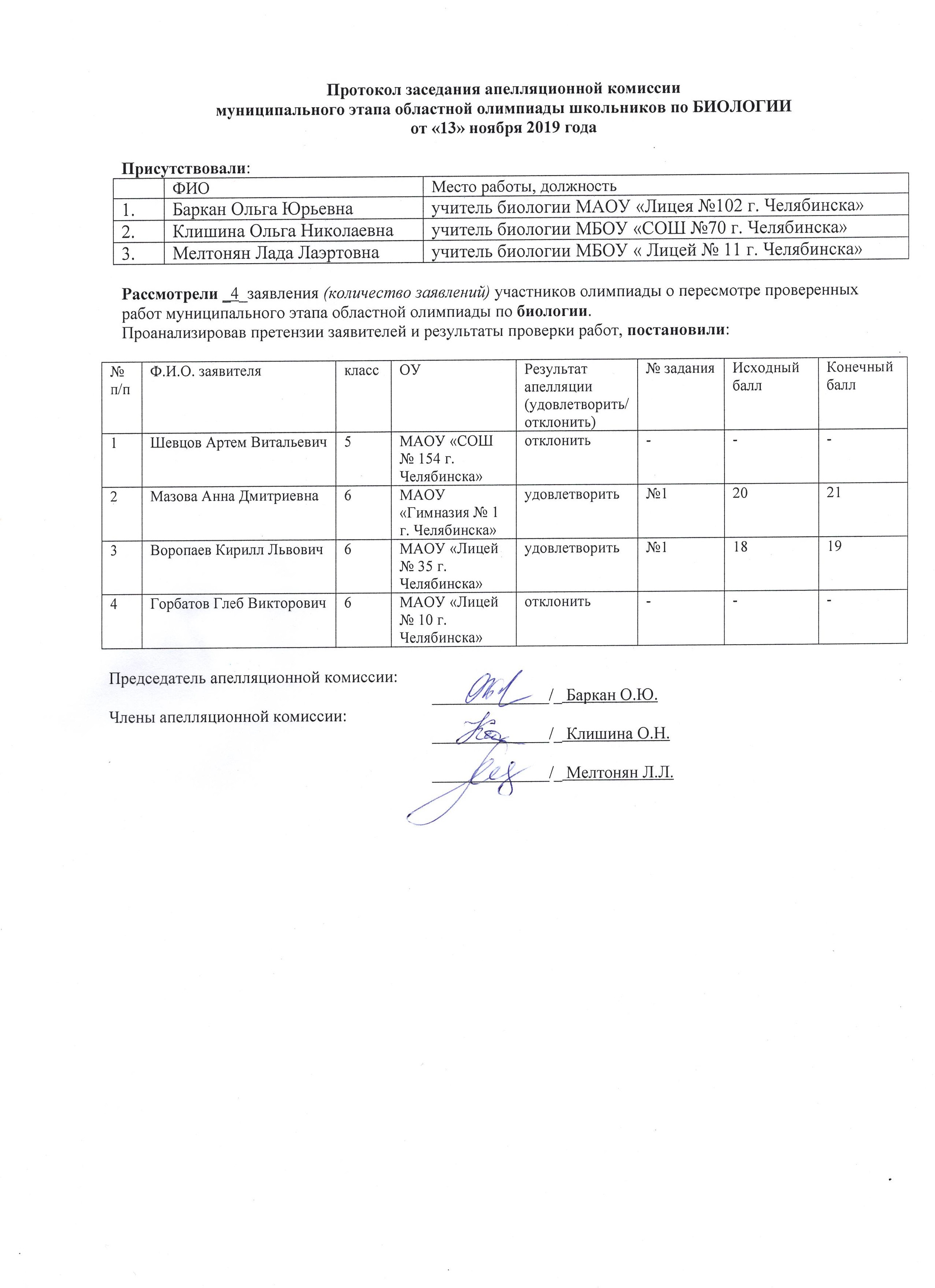 Важная информация об олимпиаде В соответствии с приказом Комитета по делам образования г. Челябинска участниками муниципального этапа являются:1) Победители и призеры муниципального этапа всероссийской олимпиады школьников прошлого учебного года (Результаты на муниципальном этапе Областной олимпиады (олимпиады юных) не учитываются!!!) 2) Участники школьного этапа текущего учебного года (вне зависимости от наличия или отсутствия диплома школьного этапа), набравшие балл не менее проходного балла, установленного Комитетом по делам образования г. Челябинска. Если вы считаете, что обнаружили ошибку в списках участников, то напишите об этом в специальном разделе форума и обязательно укажите кого на ваш взгляд не хватает в списке или кто лишний. Если вы считаете, что кого-то не хватает, то обязательно укажите его ФИО, школу, класс и по какому из 2-х оснований, перечисленных выше, он должен был попасть в список. Не забудьте указать, об олимпиаде по какому предмету идет речь. Обращения, не содержащие всех вышеперечисленных данных, будут удаляться без рассмотрения. Установленные проходные баллы: 5 класс - 39 баллов 6 класс - 38 балла Протокол апелляции (794.1 Кбайт) |