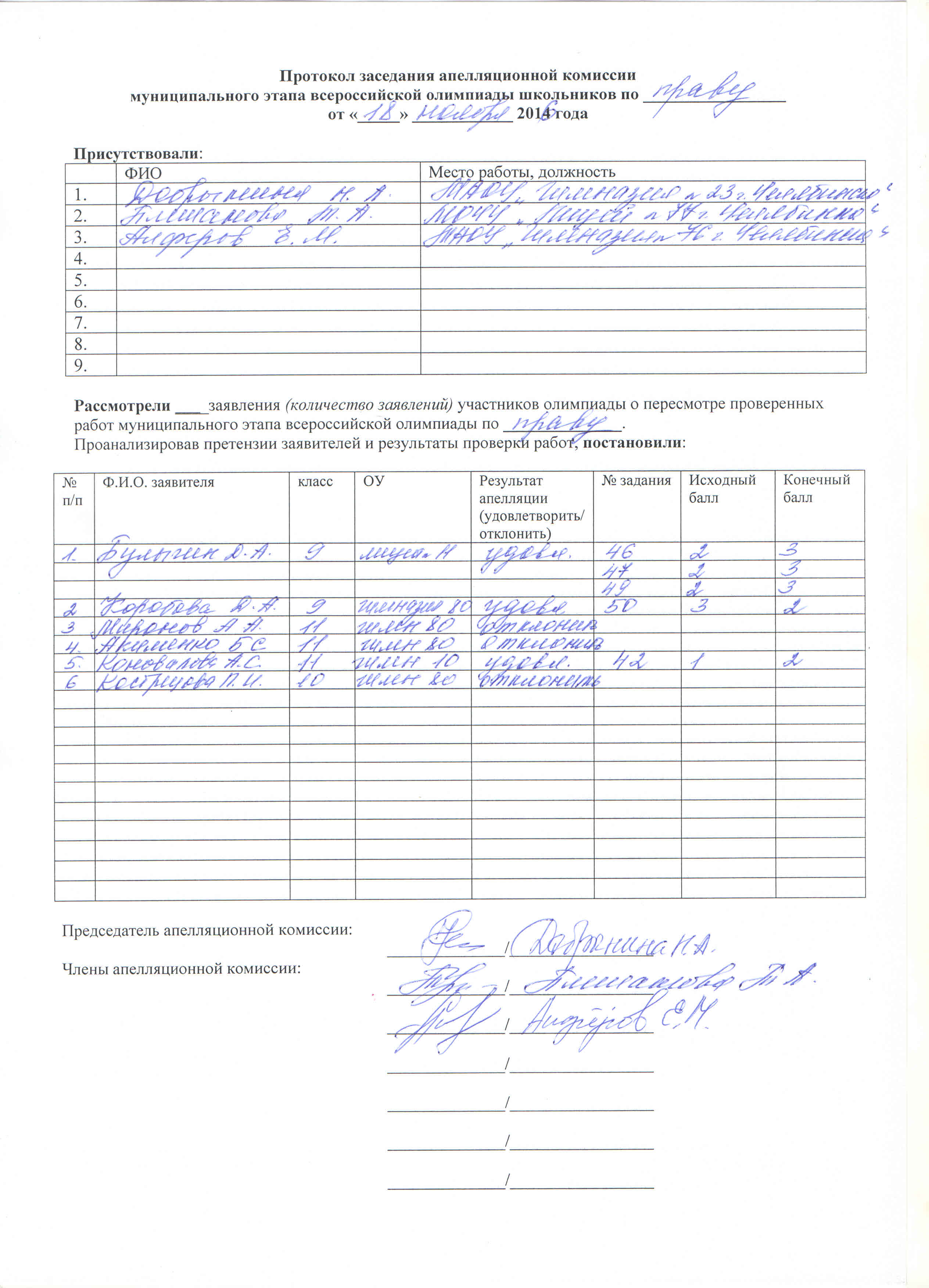 Важная информация В соответствии с приказом Комитета по делам образования г. Челябинска участниками муниципального этапа являются:1) Победители и призеры муниципального этапа всероссийской олимпиады школьников прошлого учебного года (Результаты на муниципальном этапе Областной олимпиады (олимпиады юных) не учитываются!!!) 2) Участники школьного этапа текущего учебного года (вне зависимости от наличия или отсутствия диплома школьного этапа), набравшие балл не менее проходного балла, установленного Комитетом по делам образования г. Челябинска. Если вы считаете, что обнаружили ошибку в списках участников, то напишите об этом в специальном разделе форума и обязательно укажите кого на ваш взгляд не хватает в списке или кто лишний. Если вы считаете, что кого-то не хватает, то обязательно укажите его ФИО, школу, класс и по какому из 2-х оснований, перечисленных выше, он должен был попасть в список. Не забудьте указать, об олимпиаде по какому предмету идет речь. Обращения, не содержащие всех вышеперечисленных данных, будут удаляться без рассмотрения. Установленные проходные баллы: 9 класс - 71 балл 10 класс - 69 баллов 11 класс - 63 балла Протокол апелляции (613.2 Кбайт) |