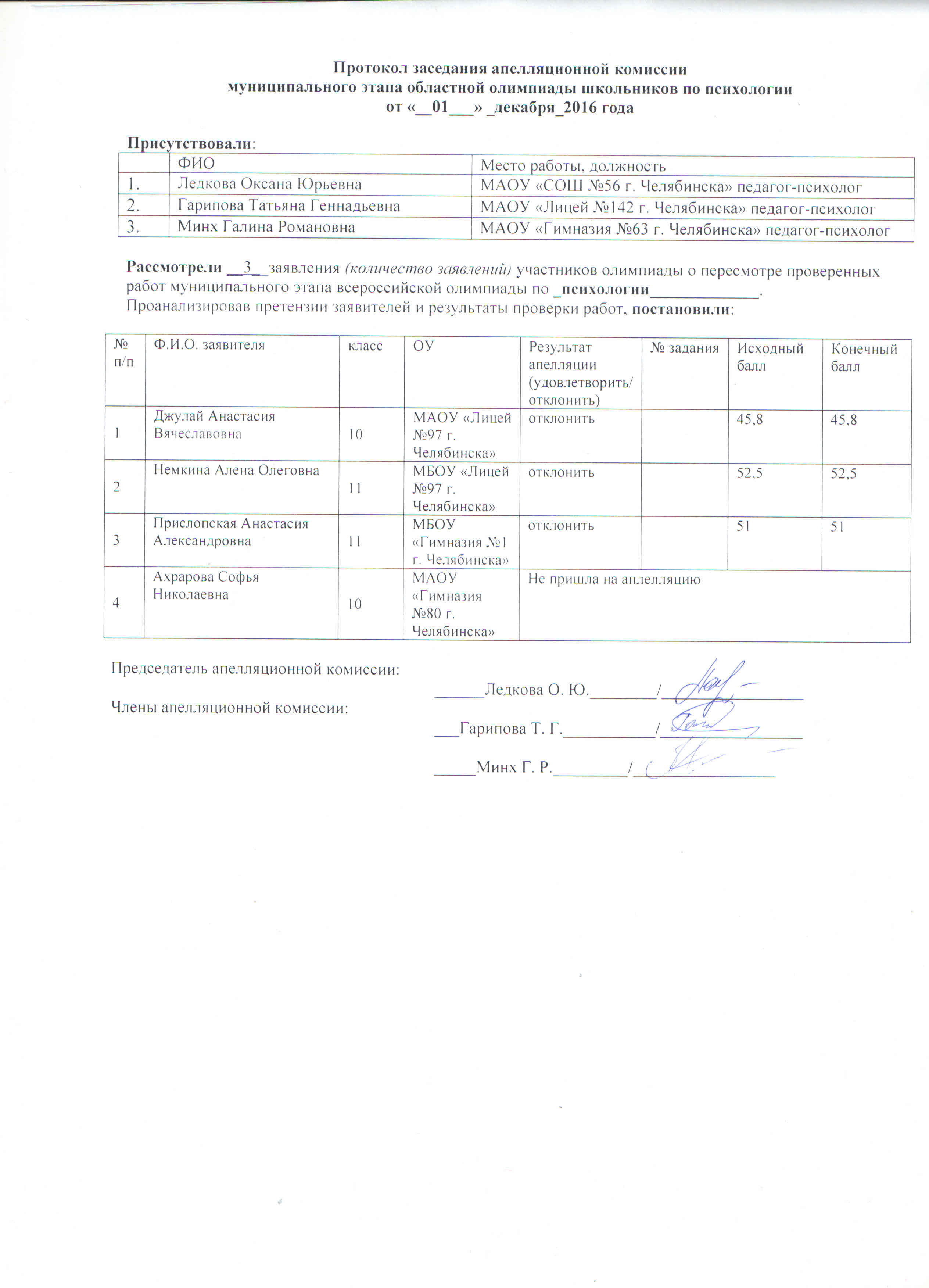 Апелляция состоится 1 декабря 2016 года в 14-00 на базе МБОУ "Гимназия №63 г. Челябинска" (ул. 3-го Интернационала, 113).