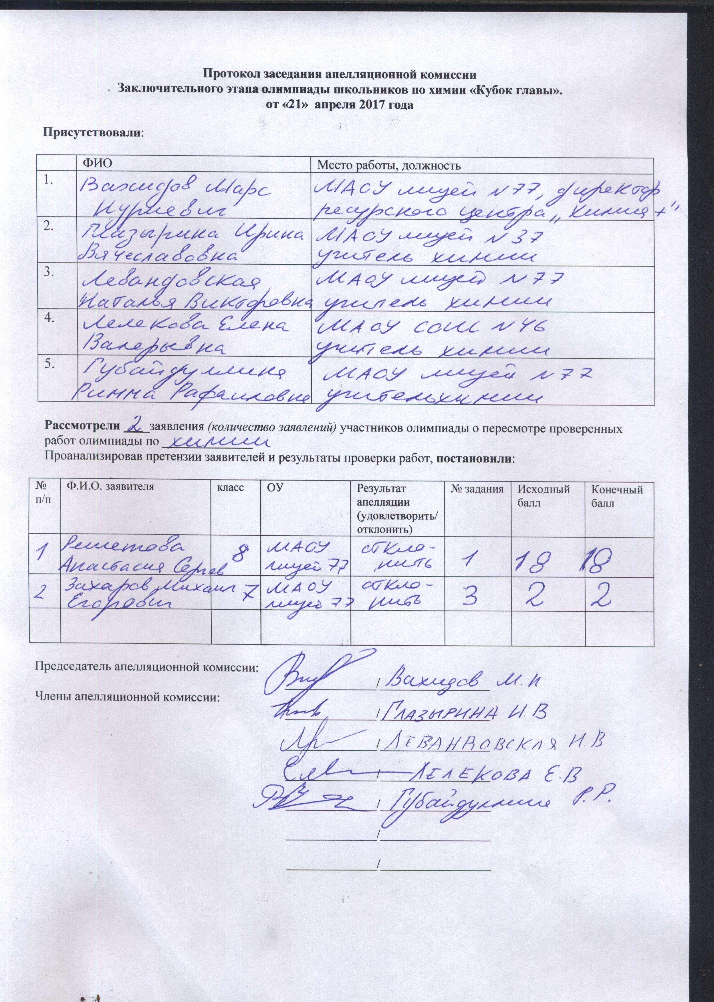 ДАТА РАБОТЫ АПЕЛЛЯЦИОННОЙ КОМИССИИ 21 АПРЕЛЯ 2017 ГОДА. ВРЕМЯ РАБОТЫ АПЕЛЛЯЦИОННОЙ КОМИССИИ 15.00 - 16.00. МЕСТО РАБОТЫ АПЕЛЛЯЦИОННОЙ КОМИССИИ МАОУ ЛИЦЕЙ № 77. ул. ЕРЕВАНСКАЯ , ДОМ 16.